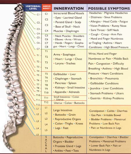 Now, I had always known already at this point in life that I wanted to go into the medical field.  However, it was the holistic approach to healthcare that cured what the allopathic side nearly patched for the past 5 years of my life.  It truly was a life-changing experience and was the motivation for me to become a chiropractor. I’ve included a chart for you to look over.  It shows where the nerves go to after leaving the spine. You want to keep your spine healthy to ensure that the important messages that travel up and down these nerves are able to send and be received without any interference.  That’s where chiropractic comes in.  For more information, please see my other blog entries under the FAQ section.